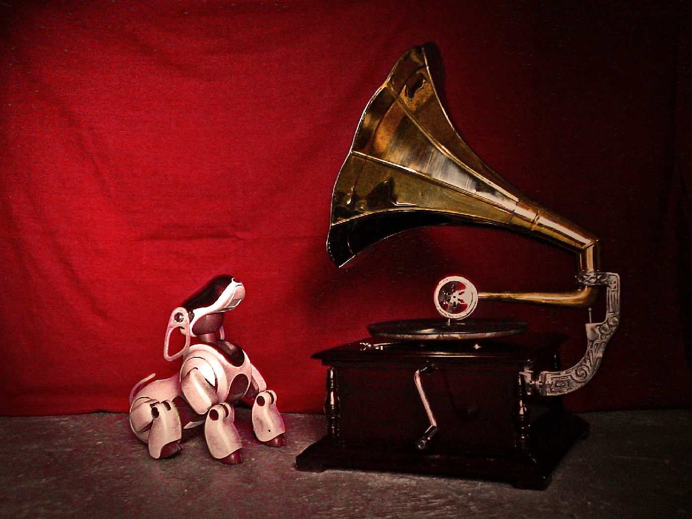 Un perro robótico juega y baila siguiendo las órdenes que le dicta “la voz de su amo” que no es otra que la música y voces grabadas en un viejo gramófono.